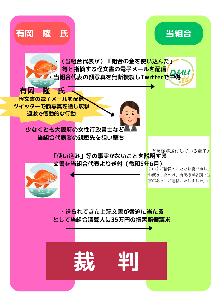 また、有岡隆氏は、裁判内でも自ら認めている通り、当組合において「金の使い込み」が発生しているという怪文書の電子メールを配信したほか、ツイッターで当組合清算人の顔写真を無断複製して当組合清算人を攻撃するツイートを配信したことも裁判内で認めていますが、現に訴訟で係争中であって、有岡隆氏の発信内容は全く事実に反しますので、注意を喚起させていただきます。