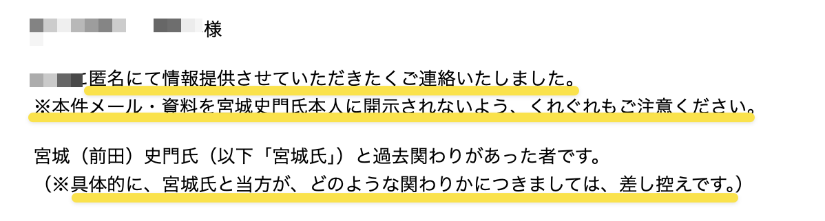 ・有岡隆氏、「匿名にて情報提供させていただきたくご連絡いたしました」などとして、当組合代表が行政書士法違反の行為をしている、「組合の金を使い込む」「私的に使い込んでいる」「これ以上宮城⽒が問題⾏動を起こさないようにするため、情報提供いたしました」(以上、有岡隆氏の電子メールより引用)などとする怪文書の電子メールを配信